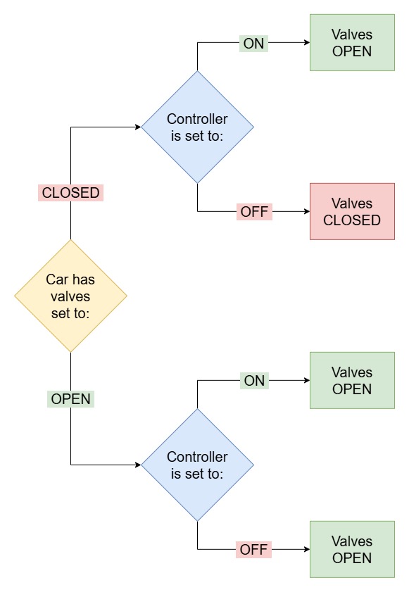 - Press the controller off button ( - ), the valves will return to normal which should be closed since the car had them closed.